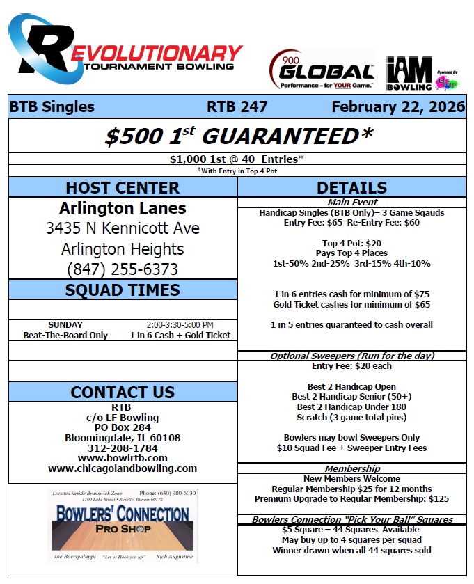 Jan. 25, 2026: BTB Singles (RTB 245) at Arlington Lanes in Arlington Heights