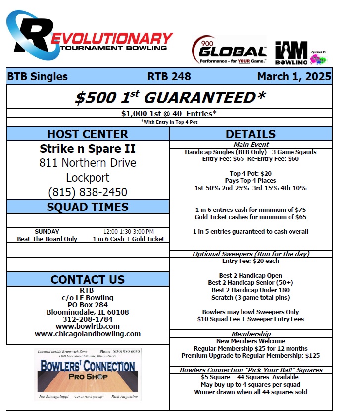 - Mar. 1: BTB Singles at Strike n Spare II in Lockport